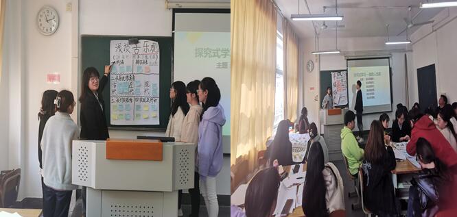 本次小班专题探究式教学活动分三个阶段。第一阶段课前准备。在课前,老师将班级同学分为六个小组,由每个小组自选主题,“浅议幸福观”“浅议得失观”“浅议苦乐观”“浅议顺逆观”“浅议生死观”“浅议荣辱观”任选其一,查找主题相关资料。第二阶段课堂研讨。为激活思政课堂,课上以设问、应答的互动方式回顾核心理论开始,张老师以“一根竹竿的智慧力量”游戏,引导每一位同学都参与到小组的探究式学习之中,激发其以不同视角进行思考,启迪思想的火花。随后,张老师提出探究学习步骤和要求,指导各组围绕选题从内涵界定、辩证关系、历史维度等方面入手,联系百年党史、联系青年学生实现正确人生观的路径和举措等,理清逻辑脉络并构建框架。各组同学将课前准备的资料进行分享整合,讨论所选主题的内容框架,进一步查找资料,开展深入研究,并形成观点。和谐轻松且富有挑战的班级探究学习氛围,使每一位同学都愿意畅所欲言,纷纷阐述思路、观点和论据。期间,老师走进每一个小组和学生进行互动交流,了解他们的探究思路,并给予针对性地指导。研讨过后,组内合作整合探究成果。第三阶段现场成果展示。6个小组分别汇报展示他们的探究成果。他们侃侃而谈,展示不同人生观所表现的多视角解读,并提出树立正确人生观的路径和措施。对于“幸福观”,第一组从幸福的内涵开始,围绕“幸福是奋斗出来的”观点,通过研习习近平总书记的奋斗幸福观和马克思主义的劳动观,分享了幸福与奋斗、劳动的逻辑关系,并沿着历史的进程,回溯了古今仁人志士用奋斗创造幸福的实证。进而提出:新时代青年大学生唯有在实践中弘扬和践行艰苦奋斗优良传统,以奋斗作为多彩青春的底色,才能收获真正的幸福。第五组从历史的维度充分论证了“生与死”的辩证关系,通过抗击新冠肺炎前线医护人员以及喀喇昆仑高原戍边牺牲烈士等事例,展示了他们对于“生死观”的理解,不仅要敬畏生命,更应拼搏进取、担当使命,在服务人民、投身民族伟大复兴事业中开发出生命所蕴藏的巨大潜能,努力给有限的个体生命赋予更有价值的意义。针对每个小组的汇报成果,老师进行了认真细致的点评,充分肯定了同学们的学习态度和探究成果:逻辑有序、观点明确、表达清晰、结构完整,对于个别小组汇报成果中存在的不足予以指正。汇报结束,同学们打分评选前三名。(后续阶段:小组进一步整合完善,提交论文。)