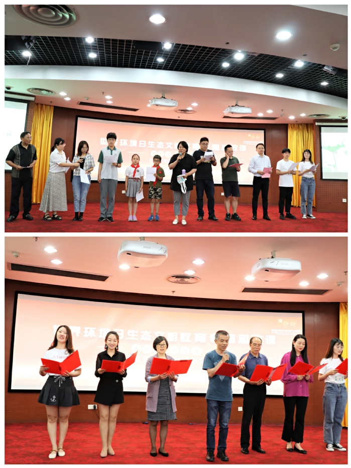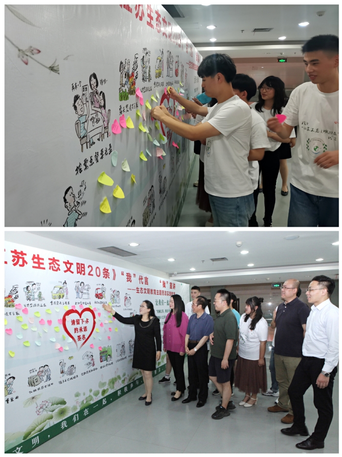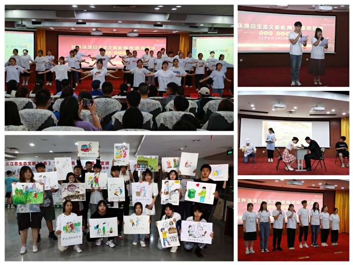 这堂思政大课,师生共同通过引、导、看、演、唱、画、说、誓等形式,宣讲并代言《江苏生态文明20条》。活动开始,来自不同班级的50名学生进行“快闪——环保舞”的表演,热情洋溢的舞蹈瞬间将课堂气氛点燃。主讲教师张玉兰教授从习近平生态文明思想及其实践的维度阐述了此次主题思政课的重要价值;视频展示环节,青年学生们以影像资料再现了宣传《江苏生态文明20条》的历程;表演环节,学生自编自导自演的情景剧《好日子》,让人在幽默诙谐的语言中感受环保教育的深刻意义;歌唱环节,展示了由学生改编的歌曲《歌唱江苏生态文明20条》,通过师生同唱的方式传达出生态文明建设的美好期许;绘画环节,学生以漫画的形式,展示了对生态文明建设的理解。最后,在全体教师的领读下,所有嘉宾和学生们共同宣读誓词:争做环保教育的传播者、践行者和推动者,将生态文明理念内化于心,外化于行。