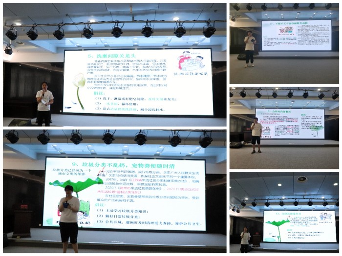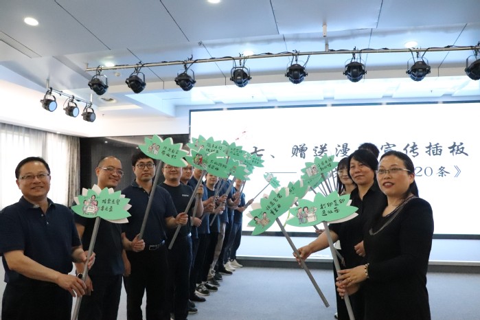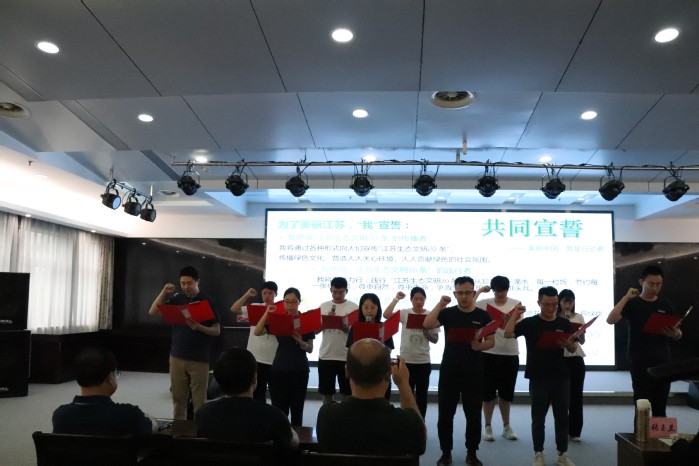 主场是由学生宣讲小分队带来的《江苏生态文明20条》宣讲。理论宣讲主题鲜明,论据充分,鞭辟入里、发人深省。刘志高同学将父辈事例娓娓道来,阐明粮食安全之重要性。李丽以数据支撑观点,“每月少乘一次电梯,一年就可减碳48千克”,倡议大家少乘电梯勤爬楼;焦邦豪同学从节约燃油资源、减少废气排放、降低噪音污染等方面谈及新能源汽车的优势,从而提倡选车优选新能源。朱飞爽同学从造纸的工序讲起,说明造纸中的资源消耗,倡议大家特别是上班族打印复印选双面。陈鹏程同学从贴近南京市民的秦淮河的今夕对比,阐述了保护河湖资源的重要现实意义。环保知识竞答环节,在场员工积极踊跃,展现了大峘人超高的知识素养和生态文明意识。最后,由集团代表和师生代表上台,为建设美丽新江苏而共同宣誓。宣誓过后,企业负责人从张玉兰教授手中庄严接过《江苏生态文明20条》漫画宣传板,预示着此次生态文明教育将持续接力。