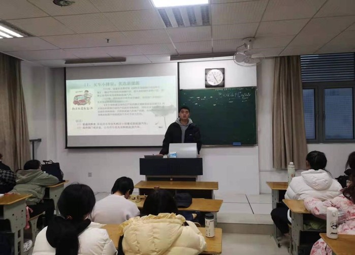 12月16日下午应天校区教学楼402,在马克思主义学院教师林娟的带领之下,思政实践课环保宣讲核心组成员走进思政小课堂,为21级建筑室内设计班带来一场环保教育宣传课。思政实践课环保宣讲核心组由不同年级不同专业的六名学生构成,他们和指导教师一起,共同策划并参与21春学期的思政实践活动——“《江苏生态文明20条》我宣讲我代言”,此次课堂宣讲活动是春学期环保教育活动的延伸。