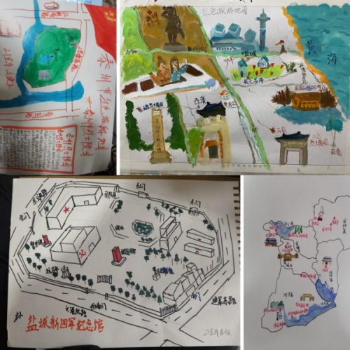 “我的家乡是盐城东台。老师让我们寻访家乡的红色文化场所,那么三仓烈士陵园必不可少,新四军纪念馆也是我们盐城地区革命文化的骄傲,我要把这些都放到我的作业中去!”设计学院室内设计专业的王慧琳,带着对家乡红色文化满满的自豪感,专门去参观了东台市三仓烈士陵园和盐城新四军纪念馆,并用手中的画笔,绘制家乡红色文化地图。