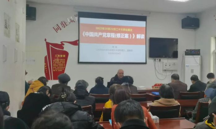 应鼓楼区江东街道白云园社区党委邀请,马克思主义学院第一党支部书记杨斌博士为社区50余名党员讲授学习新党章的专题党课。杨斌重点从党章的重要意义、深入学习党章、做学习遵守党章的模范三个方面,为社区党员讲解了党章的历史与深刻内涵,引导党员认真学习和深入贯彻党章,努力将学习成果转化为推动实践的强大动力。他强调:“党章是立党、治党、管党的总章程,党章是把握党的正确政治方向的根本准则,党章是坚持从严治党方针的根本依据,党章是党员加强党性修养的根本标准”。党课结束后,社区党员进行了学习研讨,他们表示,通过党课的学习更加深刻地理解了党章的重要意义和学习党章的重要性,纷纷表示要以党章为准则,规范自己的言行,在学习工作中,充分发挥党员的先锋模范作用。