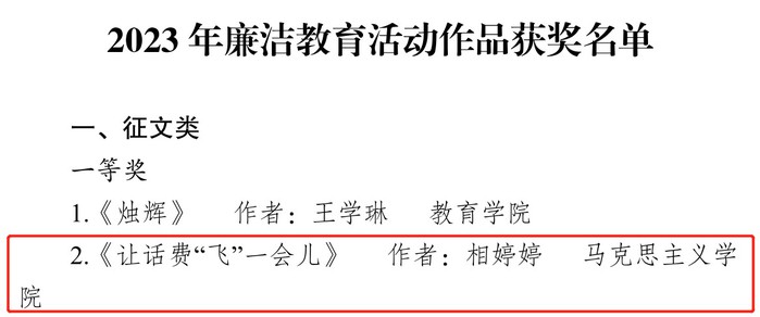 近日,学校纪委根据教育部、教育厅关于举办第八届高校廉洁教育系列活动的要求,组织开展了“廉洁润初心、铸魂担使命”廉洁教育作品活动,旨在弘扬廉洁文化,强化使命担当,营造风清气正、健康向上的校园文化环境。活动共收到各类作品194件。我院相婷婷老师的征文作品《让话费“飞”一会儿》荣获一等奖;范泽坤老师的征文作品《廉洁之风》荣获三等奖。