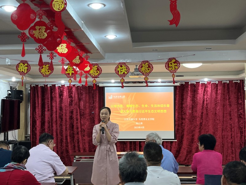 9月15日,马克思主义学院青年教师宋小洪赴秦淮区武学园社区为社区党员讲授《以绿为弦,奏响生态、生命、生活和谐乐章——深入学习贯彻习近平生态文明思想》专题党课。我院马克思主义中国化教研部教师周珊珊,思想政治教育教研部教师邓鹏以及来自武学园社区的老党员代表、企业党务工作者代表参加了本次党课。党课由武学园社区党委书记张智主持。