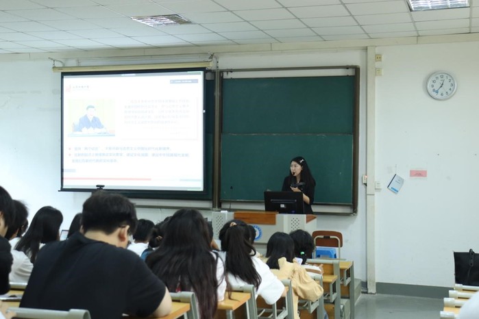 9月27日,马克思主义学院形势与政策教研部教师张丁月以《推进文化自信自强担负新的文化使命》为题,为设计学院学生讲授“开学第一课”。本次授课采取线上线下相结合的形式,各年级学生代表在东校区阶梯教室线下学习,部分学生线上直播学习,讲座由设计学院副院长孙培松主持。