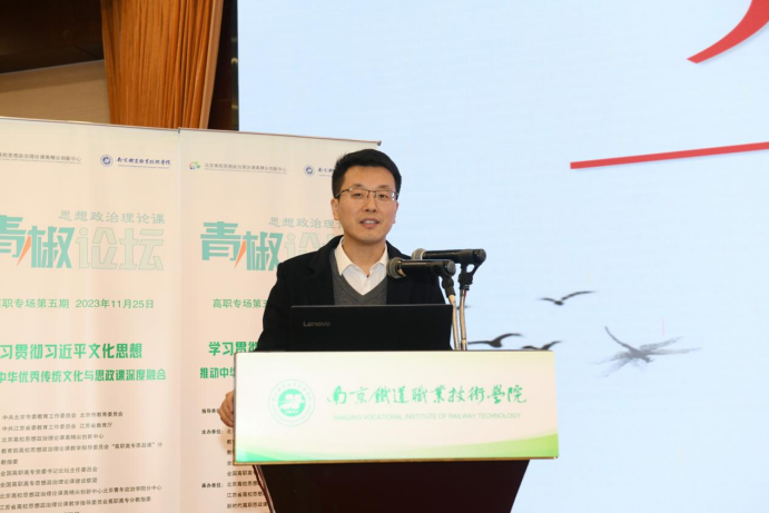 2023年11月25日,由北京高校思想政治理论课高精尖创新中心、教育部高校思想政治理论课教学指导委员会“高职高专思政课”分教指委联合主办的高校思想政治理论课“青椒论坛”高职专场第五期——《学习贯彻习近平文化思想推动中华优秀传统文化与思政课深度结合》,在南京铁道职业技术学院举办。来自北京、辽宁、四川、江西、浙江、江苏等地高职院校的8位优秀青年教师就相关主题进行了教育教学经验分享,论坛邀请南京航空航天大学马克思主义学院党委书记徐川、南京大学马克思主义学院院长胡大平进行点评。马克思主义学院组织11位青年教师参加了此次论坛。
