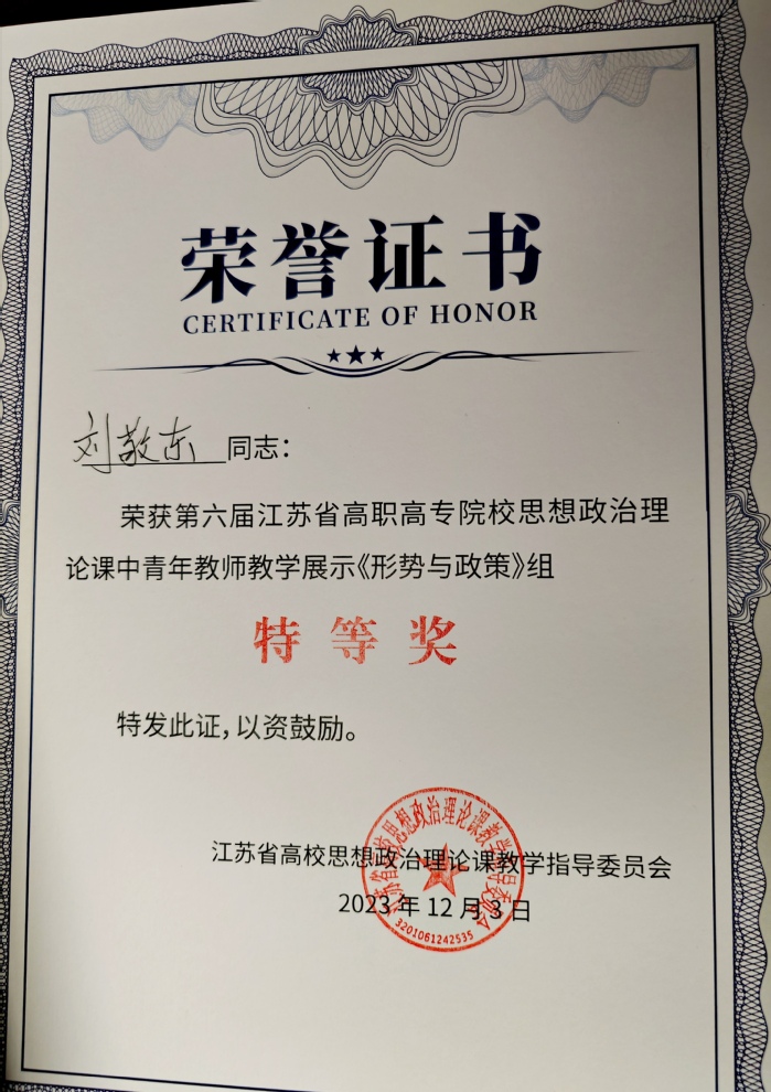 近日,第六届江苏省高职高专院校思想政治理论课中青年教师教学展示在苏州经贸职业技术学院举行。我校马克思主义学院形势与政策教研部青年教师刘敬东荣获特等奖。