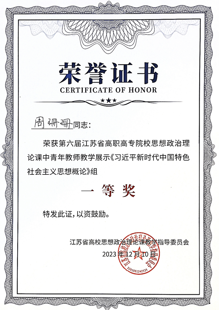 马克思主义学院青年教师周珊珊荣获第六届江苏省高职高专院校思政课中青年教师教学展示“习近平新时代中国特色社会主义思想概论”课程组一等奖