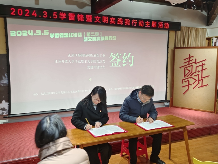 党建引领“志愿红”,政校合作“暖民心”。马克思主义学院与梅园新村街道双向赋能,围绕基层党员冬训、新时代文明实践等共谋共建,取得喜人成绩。在前期合作基础上,张露与梅园新村街道党工委书记汪拥政签订党建共建协议。张丁月、刘敬东、邓鹏、韦庆玲受聘为梅园新村街道基层党员冬训理论宣讲志愿讲师。签约双方一致认为:一是要向深融合,善弹“合奏曲”,把党史学习教育融入精神文明创建和群众性文化活动;二是要向下扎根,当好“传声筒”,依托高校师生宣讲团队和“知行玄武”理论宣讲联盟,让党的创新理论“飞入寻常百姓家”;三是要向远着眼,挖掘“闪光点”,总结形成既有特色又可借鉴推广的典型经验和扎实成果。