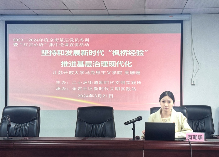 2024年3月20-21日,马克思主义学院青年教师周珊珊赴江心洲街道洲岛绿园社区和永定社区讲授专题党课,习近平新时代中国特色社会主义思想教研部教师宋点、施琪、社区工作人员及居民党员参加学习。