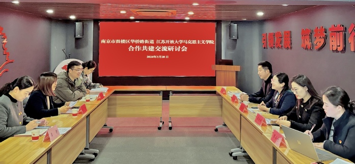 为加强交流合作,形成多层次、宽领域的共建格局,3月28日下午,马克思主义学院院长季海菊带队赴华侨路街道金陵汇红色街区党群服务中心开展实地调研,华侨路街道党工委副书记吴娜、党建办主任李静、宣传委员滕毅及社工队伍代表参加座谈交流,学院副教授、校党政干部教育培训中心执行主任陈大鹏、办公室主任李欢欢、学院青年教师代表常小竹、宋小洪一同参加本次调研。