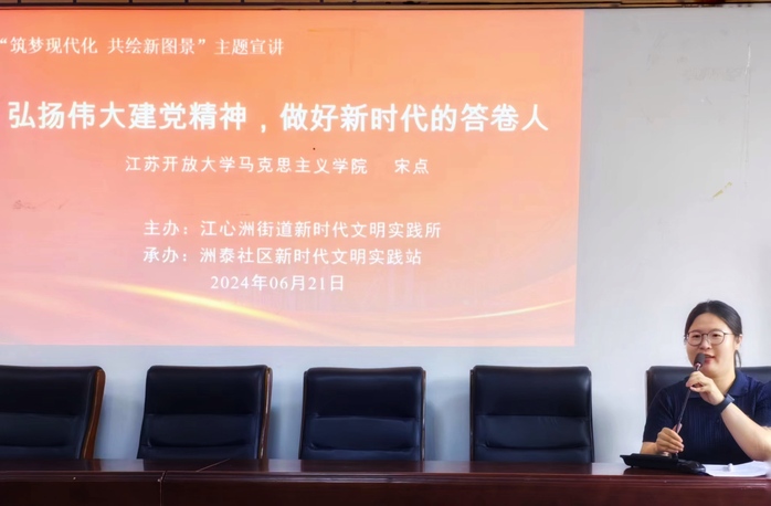 6月21日上午,马克思主义学院青年教师宋点赴江心洲街道洲泰社区讲授专题党课,习近平新时代中国特色社会主义思想教研部教师施琪、社区工作人员及居民党员参加学习。党课由洲泰社区党总支书记李光福主持。