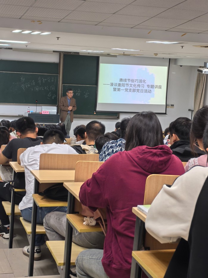10月12日上午,马克思主义中国化教研部和第一党支部以“文化铸魂——传统文化进思政课堂”为主题,邀请原马克思主义学院党总支书记、院长史灿方,在应天校区教学楼103教室开展“赓续节俗巧活化——漫谈重阳节文化传习”专题讲座暨第一党支部党日活动。马克思主义学院党总支书记张露、副院长陆洋、马克思主义中国化教研部全体教师和第一党支部党员、学生代表等160多人参加,活动由马克思主义学院院长季海菊主持。