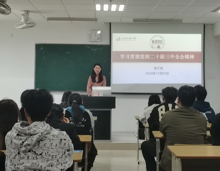 张丁月以“学习贯彻党的二十届三中全会精神”为题开展专题讲座,以“改革”二字为引,从历史维度、现实需求等角度向同学们介绍了党的二十届三中全会的重大意义,号召同学们深刻领悟党的二十届三中全会的重大意义,守正创新、奋发进取、积极作为,在学思用贯通中担当好新时代青年的责任。