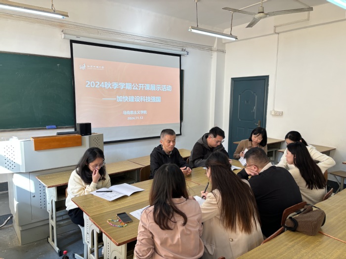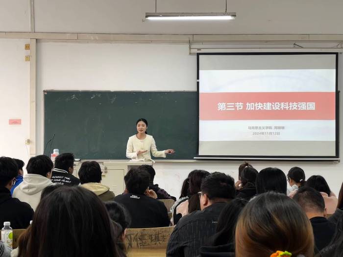 11月12日上午,马克思主义学院习近平新时代中国特色社会主义思想教研部青年教师周珊珊在《习近平新时代中国特色社会主义思想概论》的课堂上,为商学院2023级现代物流管理1、2班的同学们带来了一堂主题为“加快建设科技强国”的公开课。我校马克思主义学院副院长陆洋及部分教师现场观摩听课。