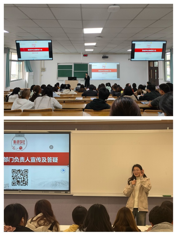 专场推介,精准动员。为进一步深化新生对社团的了解,新语学社于10月27日和10月30日,分别在应天校区和东校区面向2025级团支部书记和组织委员举办了专场推介会。推介会上,指导教师董迅石、韦庆玲从宏观视角出发,阐述了新语学社在连接理论知识与青年实践、提升成员综合素养方面的桥梁作用。社团各部门负责人则围绕具体工作,详细介绍了活动规划与招新要求,并就同学们关心的问题进行了解答。两场推介会交流充分,互动频繁。