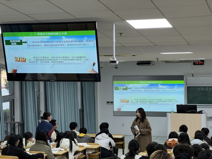 12月1日下午,马克思主义学院青年教师高子涵以“以改革创新为核心的时代精神”为主题,在应天校区教学楼101教室为2025级建筑智能化工程技术、2025级室内设计专业学生开展“思想道德与法治”公开课。院长季海菊及部分授课教师现场观摩听课。