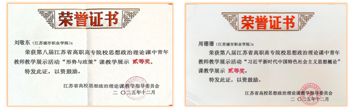12月13日-14日,由江苏省高校思想政治理论课教学指导委员会主办的第八届高职高专院校思政课中青年教师教学展示活动在无锡、常州落下帷幕。来自全省各院校的112名选手通过网上初评,成功进入本次决赛,我校马克思主义学院刘敬东、周珊珊两位青年教师参赛。经过激烈角逐,两名教师分别荣获“形势与政策”和“习近平新时代中国特色社会主义思想概论”组二等奖。